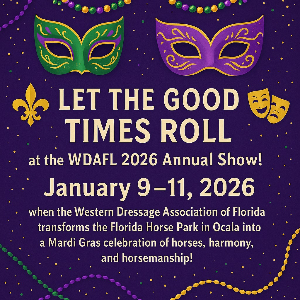 Let the Good Times Roll at the WDAFL 2026 Annual Show! Mark your calendars for January 9โ11, 2026, when the Western Dressage Association of Florida transforms the Florida Horse Park in Ocala into a Mardi Gras celebration of horses, harmony, and horsemanship!